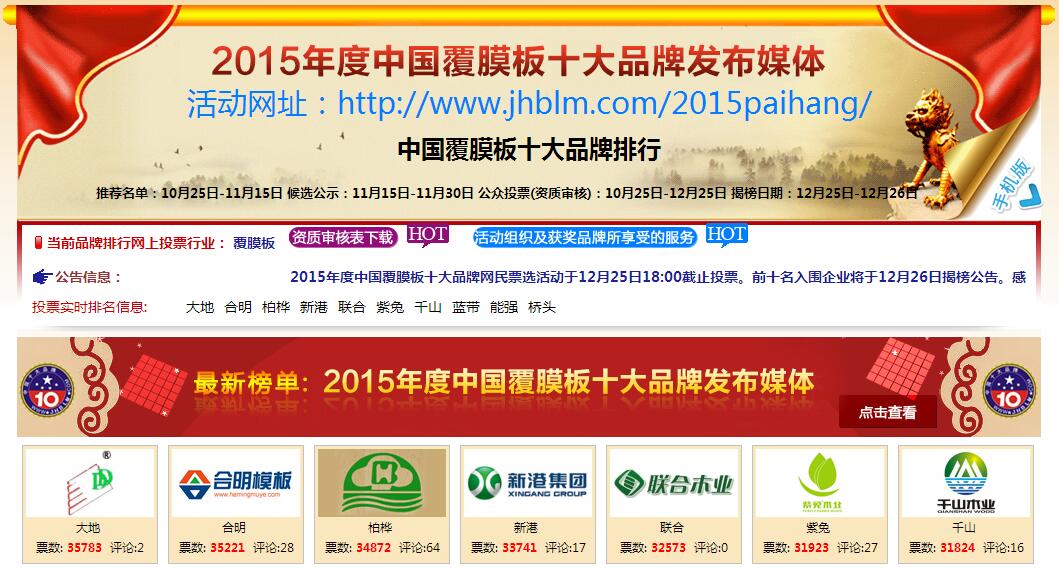 熱烈祝賀合明木業(yè)榮獲2015年度“中國覆膜板十大品牌”第二名。據(jù)悉,此次評選經(jīng)過篩選國內(nèi)具有代表性的覆膜板品牌上榜,再經(jīng)過一個月網(wǎng)絡(luò)投票,最終按照票數(shù)從高到低排列,前十名者入選。