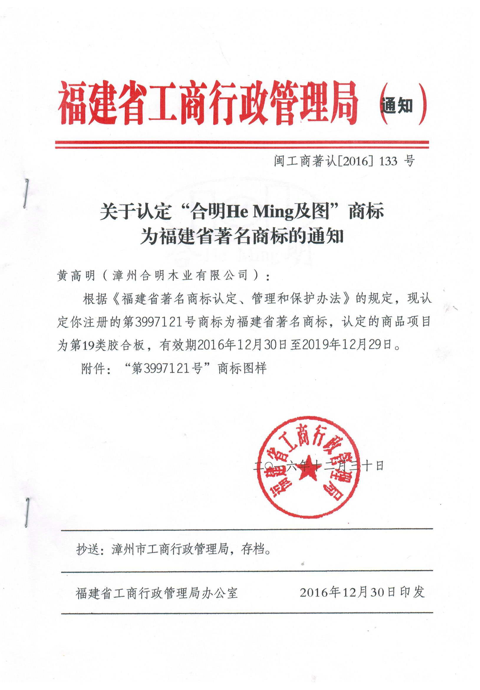 2016年12月,根據(jù)福建省工商行政管理局通知,福建合明木業(yè)有限公司的“合明+圖”,經(jīng)福建省工商局局長辦公會(huì)議研究,被正式認(rèn)定為福建省著名商標(biāo),是福建省膠合板行業(yè)年度唯一一家獲得該項(xiàng)榮譽(yù)的企業(yè)。