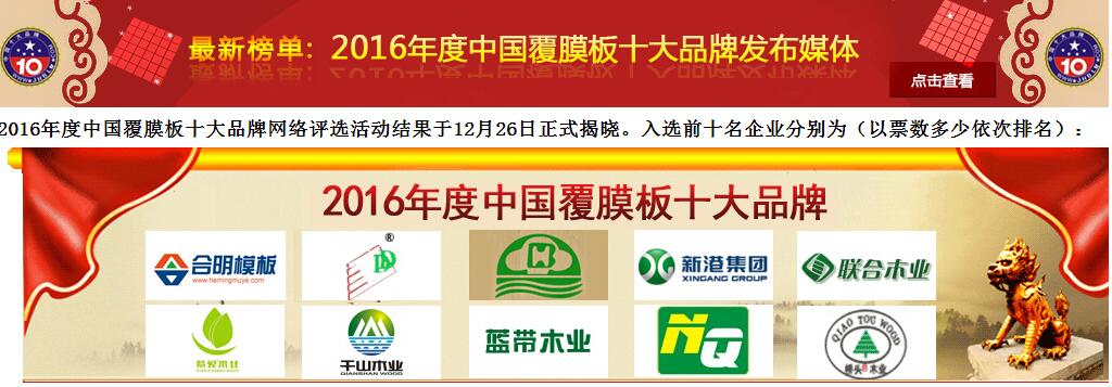 好消息!!熱烈祝賀合明建筑模板榮獲2016年度“中國(guó)覆膜板十大品牌”。該評(píng)選由中國(guó)膠合板網(wǎng)站組織評(píng)選,篩選國(guó)內(nèi)具有代表性的覆膜板品牌上榜,再經(jīng)過(guò)網(wǎng)絡(luò)投票,最終按照票數(shù)從高到低排列,前十名者入選。