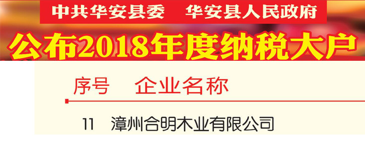 2018年度,合明模板納稅記錄良好、納稅金額大,以納稅金額第11名的成績被評為“納稅大戶”。