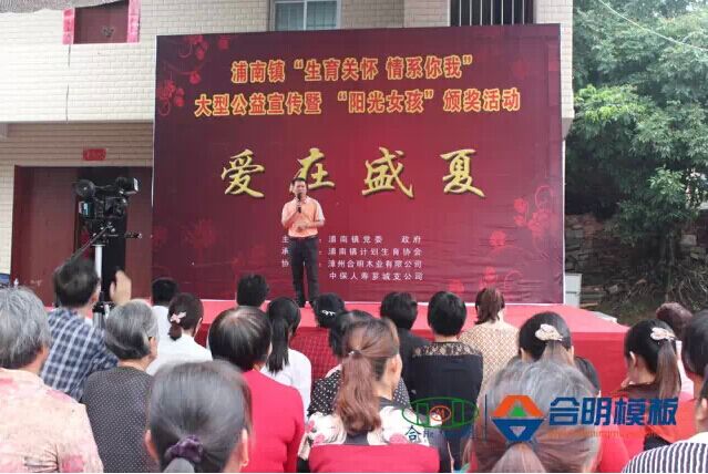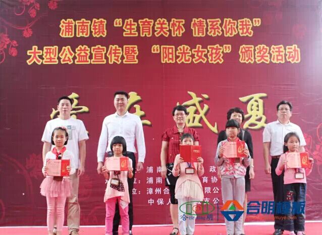 合明木業(yè)訊 25日,浦南鎮(zhèn)“生育關(guān)懷 情系你我”大型公益宣傳暨“陽光女孩”頒獎活動在浦南鎮(zhèn)活動中心熱鬧舉行。薌城區(qū)計生協(xié)張副會長、浦南鎮(zhèn)重要領(lǐng)導(dǎo)出席了本次會議。合明木業(yè)作為本次活動贊助方,總經(jīng)理黃志藝受邀上臺發(fā)表了講話,并對本次活動的入選“陽光女孩”進(jìn)行頒獎。