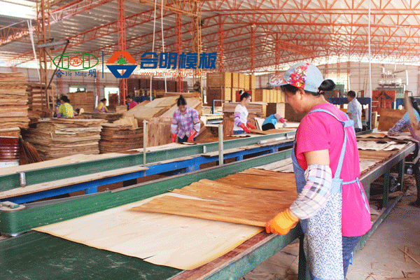 3、烘干或者曬成濕度適宜的單板。合明模板要求所有的單板濕度控制在12度-14度之間,這個濕度最能使膠板充分融合,增強(qiáng)模板膠合強(qiáng)度,提高模板周轉(zhuǎn)次數(shù)。
