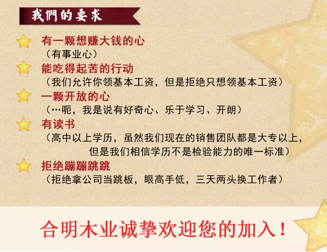 合明木業(yè)高薪誠聘啦!想要了解合明木業(yè)這家企業(yè),以及崗位要求、薪資待遇,請往下看起~