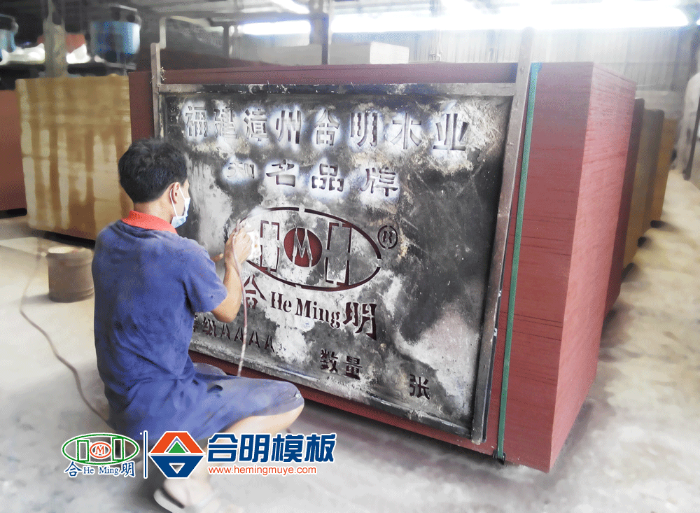 模板成品疊放整齊,四邊噴涂油性防水漆,再噴合明木業(yè)知名品牌專屬商標(biāo)。