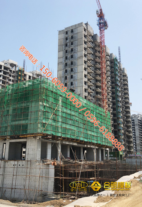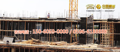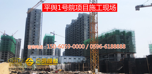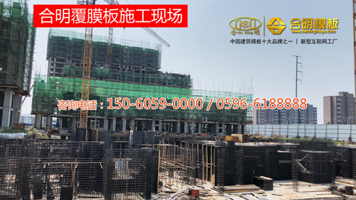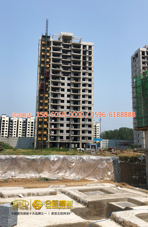 從施工照片可見(jiàn),該工程8號(hào)樓正在施工,使用的是合明覆膜板。